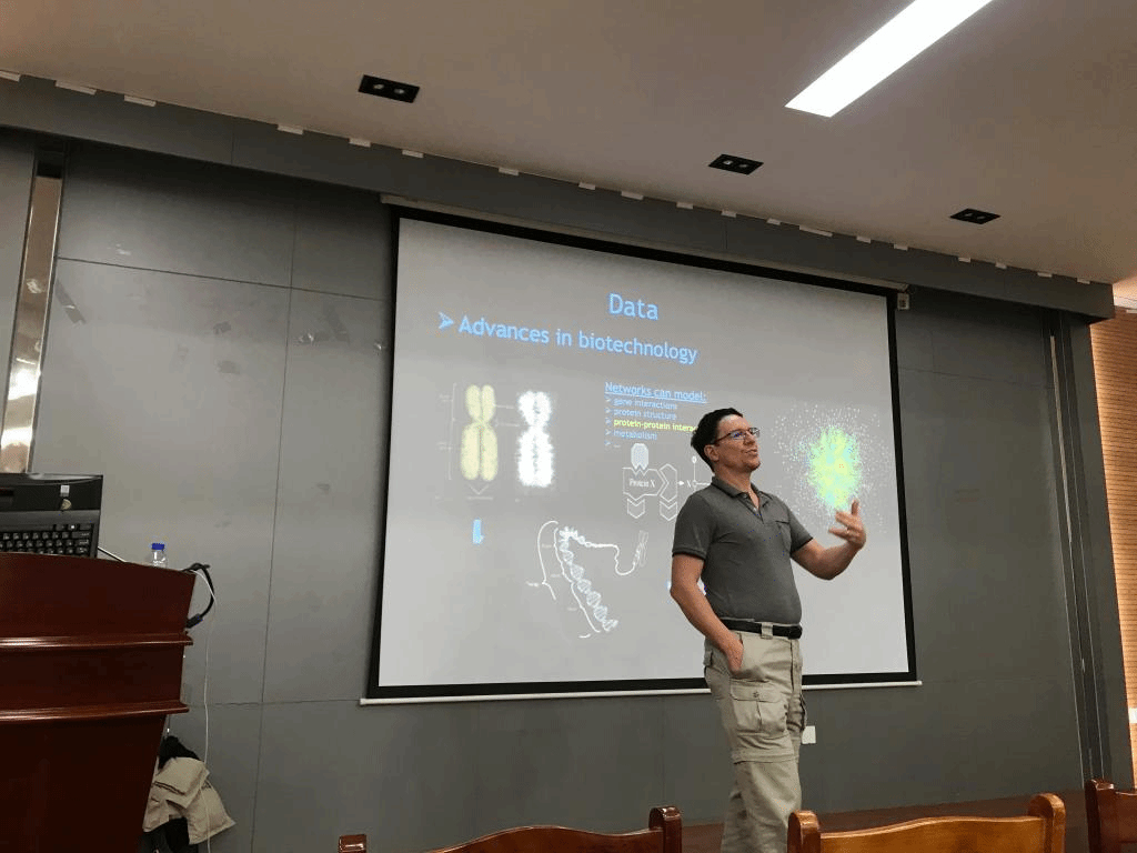 会上,Hayes教授首先通过介绍蛋白质的序列比对引出基于拓扑的网络比对。然后介绍了蛋白质网络比对的简易模型和比对方法,展示了他和他的团队研究的SANA算法,详细讲述如何将模拟退火算法应用到SANA算法中,并从各方面介绍了算法的比对效果。Hayes教授精彩的报告赢得了大家的阵阵掌声,同时又引发了与会人员的深入思考,给生物学和计算机学科的师生带来了很大的启发。