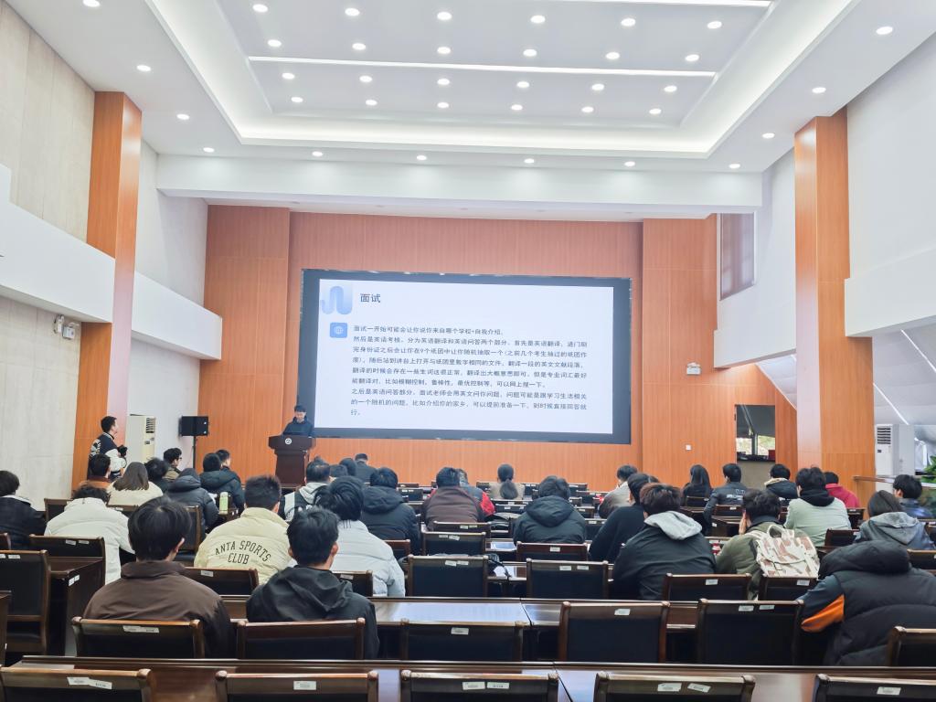 控制工程专业的朱东禹、新一代电子信息技术专业的陈毅、电气工程专业的陈顾方三位研究生则在线下结合PPT进行讲解,围绕笔试备考策略、面试流程、英语考核、专业问答等方面进行了细致分享,内容涵盖专业课程重点梳理、英文翻译与口语准备技巧、项目经历与毕业设计的应对策略等,为在场同学提供了系统、实用的备考指南。线上线下相结合的分享形式,使同学们既能获取本校复试的一手经验,又能了解其他高校的复试特点,有效拓宽了备考视野。