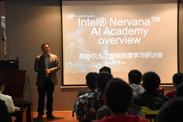 ,他们会请到人工智能的合作伙伴来为大家讲解他们眼中的人工智能,以便学生能够更好地理解什么是人工智能。他通过一些具体事例向同学们表明人工智能就在我们的身边,我们生活中的许多领域都与人工智能有了相应的结合点,例如医疗、财政、能源、以及交通等,人工智能已经无处不在。他对AI人才培训瓶颈的突破、对人工智能的创业机遇提出了独特的见解。他还带着英特尔人工智能领域的专业知识与到场同学一同进行了深度的学习研讨:以数据科学与机器学习,和神经网络与深度学习两个专业理论问题为主要讨论点,深入并全面地讲解了理论知识及理论与实例的结合运用。他表示,他们发布了面向人工智能的因特尔软件®学生开发人员计划,旨在重点展示学生与英特尔学生大使的专业知识、活跃思维和创新精神,及他们使用因特尔架构的成功经验,从而让迷奸